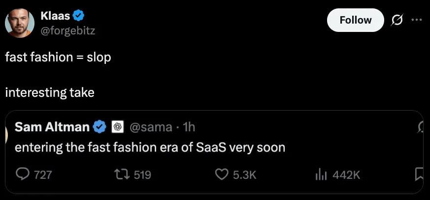 The word "fast fashion" is interesting though - suggests cheap, disposable, low-quality AI slop. Which is probably accurate for most vibe-coded solutions but it’s not in Altman’s benefit to point this out. I think he’s trolling a bit for engagement - he’s pretty damn good at that!