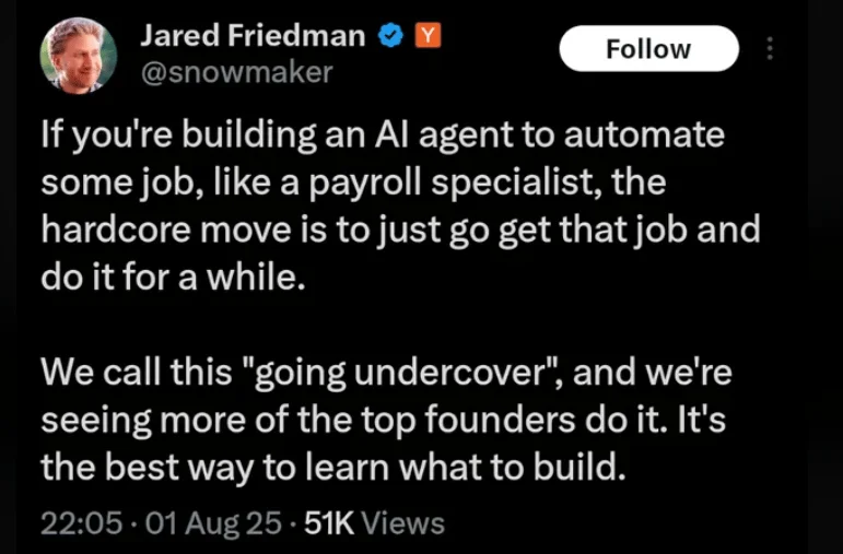 You already know exactly what's broken, what's annoying, what takes forever. Skip the "undercover" nonsense and build solutions for problems you've personally felt. Every industry expert watching this is better positioned than some 19-year-old Stanford dropout pretending to be a payroll clerk.