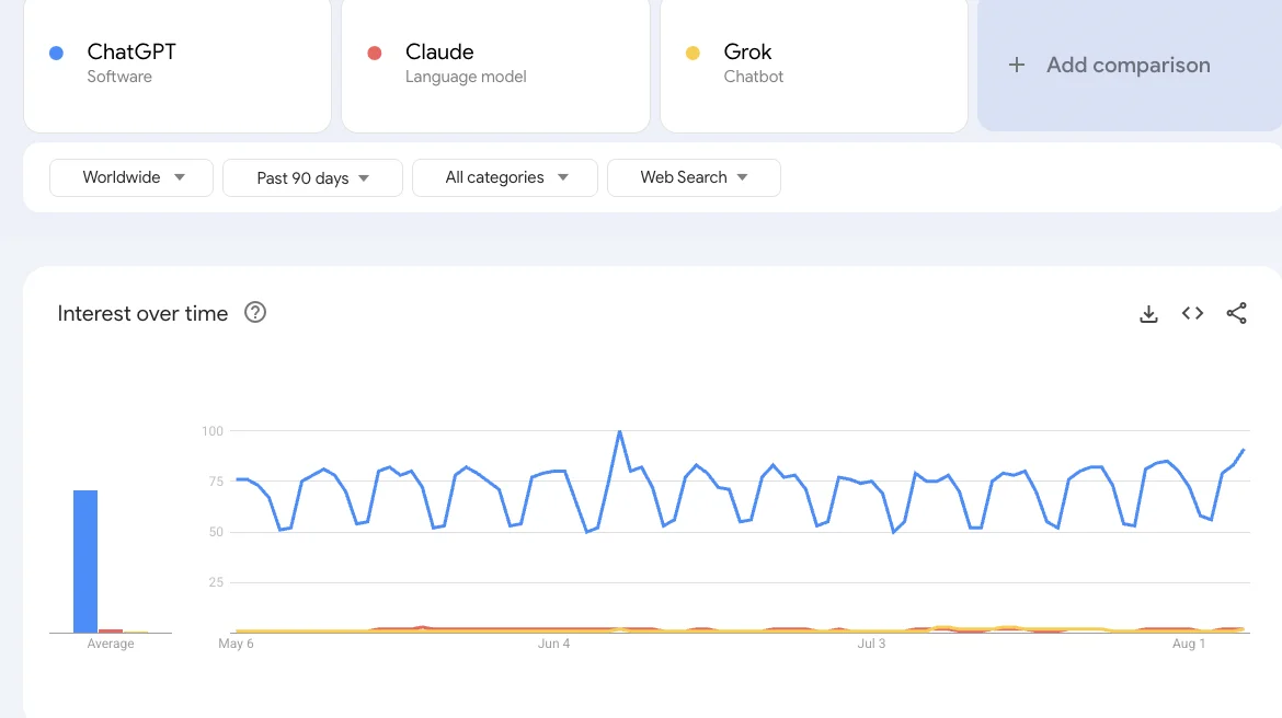 The Google Trends data doesn't lie - ChatGPT dominates public consciousness whilst Claude barely registers. Quality matters, but so does marketing, and Anthropic's rubbish at the latter.