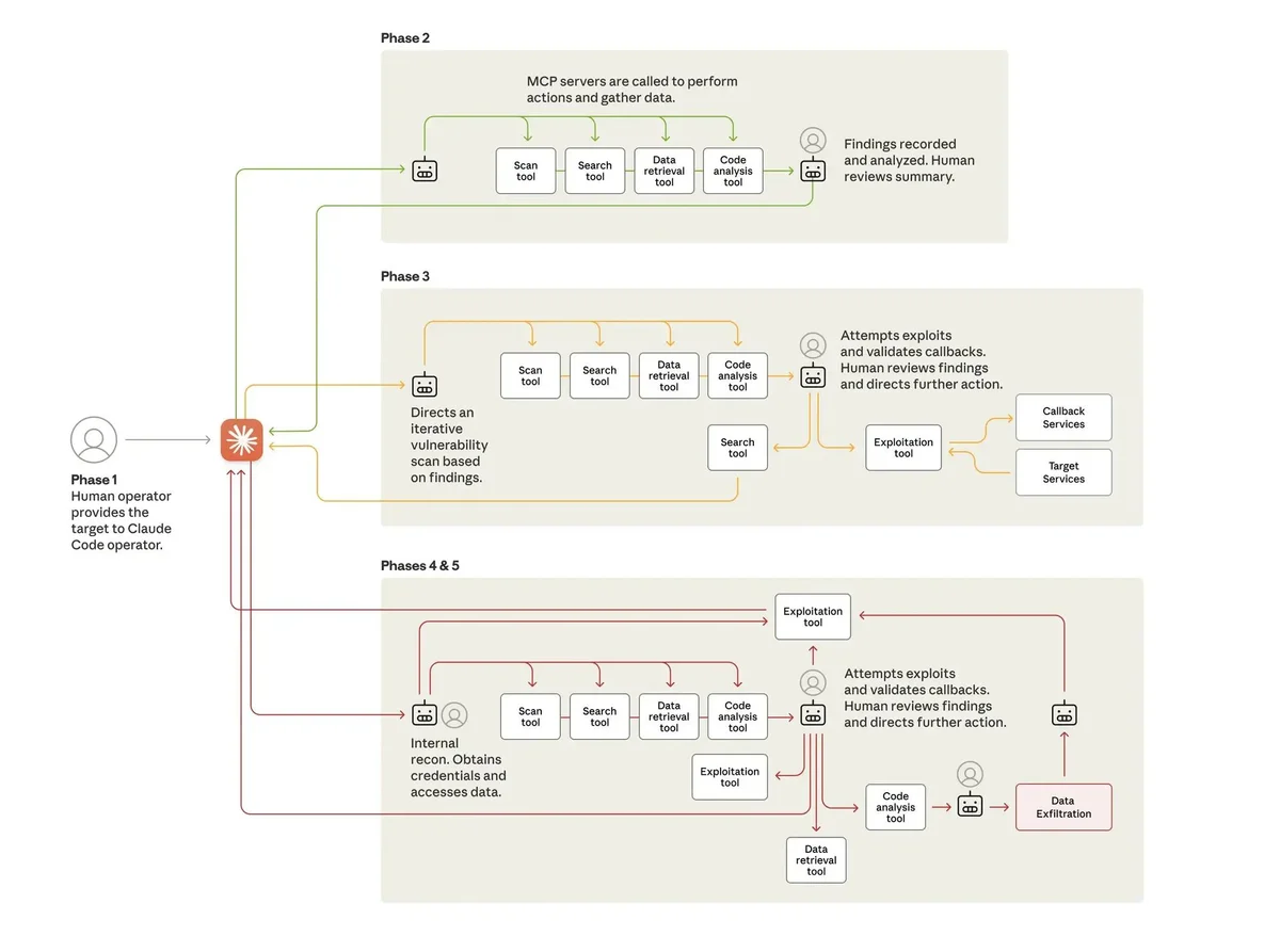 They published a nice flowchart showing exactly how the attack worked - phase 1: target selection, phase 2: vulnerability scanning, phase 3: iterative exploitation, phase 4: credential theft. Thanks for the manual, Anthropic!