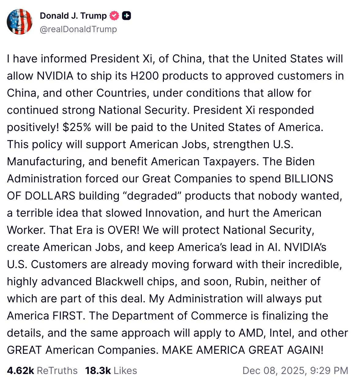 Trump's given Nvidia the green light to sell advanced H200 chips to China - the workhorse GPUs that are used to train frontier models. Previously restricted for national security, now allowed to "approved customers" (who can then sell them on to anyone, let's be real).
