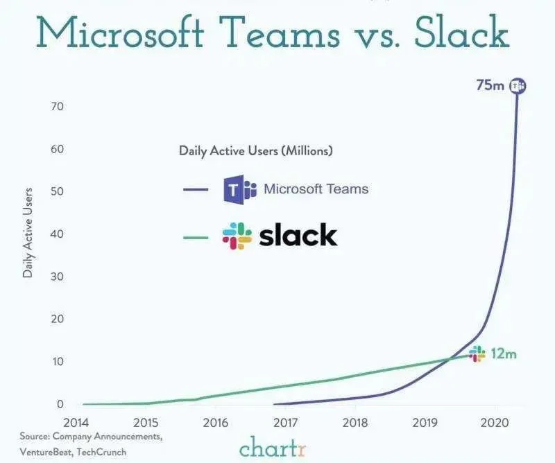 But look at the growth charts - Teams absolutely buried Slack. Microsoft had distribution. An existing audience. People they could talk to.