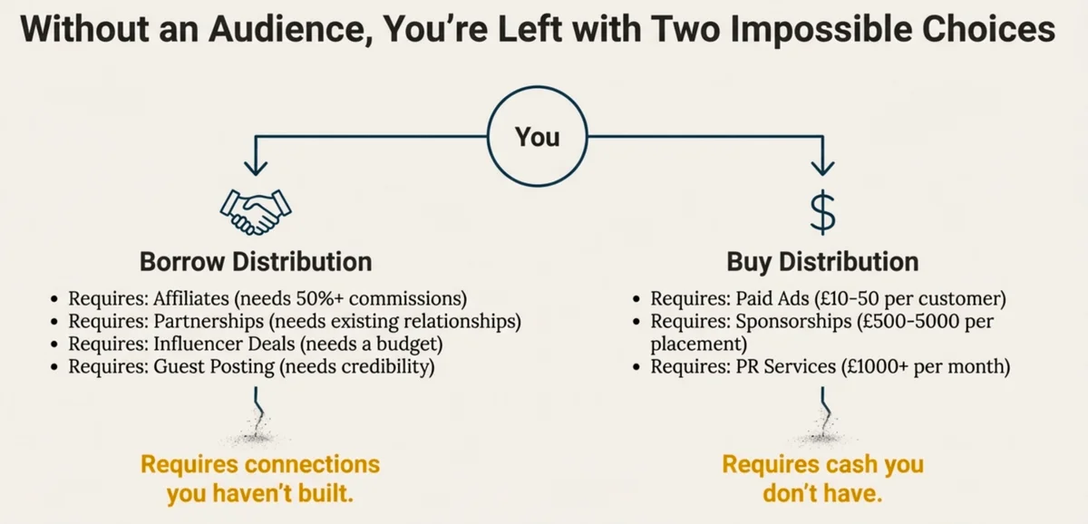 Without an audience, you have two options. You can borrow distribution - come to someone like me and say "Kyle, promote my thing." Maybe I say yes for 50% commission, maybe I want £2,000, maybe I just say no. Hint: I say no. Notice how I don’t do sponsored posts!