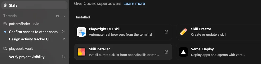 Thankfully Codex has a Skill called Vercel Deploy. Click Skills then Vercel Deploy to add it to your project.