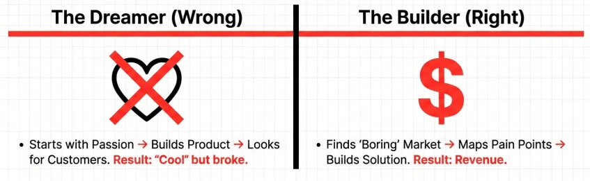 Start with the market, not your idea. This is the single most important flip you can make as an entrepreneur. Most people start with something they think is cool, build it, take it to market, and nobody cares. The market does not care about your passions. It cares about what fixes its problems. So we don't start with a product. We start by finding who has expensive problems.