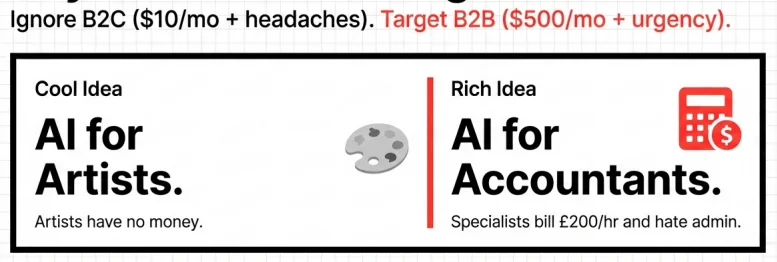 Step 1: Hunt for boring industries. We're not looking for sexy markets. Not crypto, not social media, not AI for artists (artists don't have money, sorry). We want boring B2B industries where businesses already spend money solving problems. Accountants, lawyers, estate agents, logistics. Use an AI deep research agent (Manus, Claude, or ChatGPT deep research mode) and feed it your background, work experience, and a few seed industries you're curious about. Tell it to find markets where businesses have expensive problems, communities where people actively complain about time-consuming tasks, evidence of current spending on solutions, and growing trends in Google Trends and Reddit. It'll come back with three to five boring but lucrative markets.