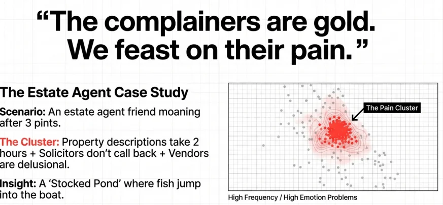 idual complaints. You want constellations of problems that cluster together, like an estate agent telling you that property descriptions take two hours, solicitors don't call back, and vendors are delusional. That's three problems in one conversation. A stocked pond.
