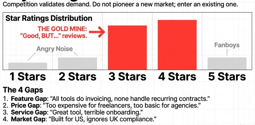 Step 3: Mine the 3 and 4-star reviews. Find existing products in those industries and scrape their reviews from Capterra, G2, Trustpilot, and Reddit. Ignore the 1-star and 5-star reviews entirely. Five-star reviews are useless: "Great product, love it." Tells you nothing. One-star reviews are written by people with an axe to grind, too emotional, too noisy. The three and four-star reviews are where the insight lives. Someone who gives four stars instead of five has made a conscious decision. They'll explain exactly what's missing. You're hunting for four types of gaps: feature gaps, price gaps, service gaps, and market gaps.