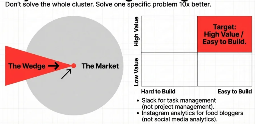 Step 4: Find your wedge. Feed all of this research into an AI and ask it to plot each problem on a two-by-two matrix: high value vs low value, easy to build vs hard to build. Your entry point is the top-left quadrant. High value problem, easy to build. The AI Skills Hub rebuild I've been working on is a perfect example. The government spent 4.1 million quid on a directory of links built on a $1,000/year off-the-shelf platform called Invision Community. I duplicated the whole thing in half an hour. No email wall, enriched data, proper search. Easy win, obvious improvement.