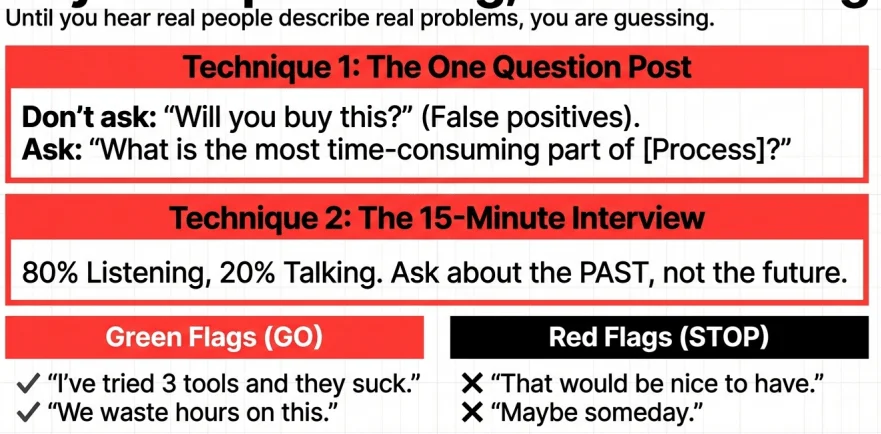 Step 5: Talk to actual humans. AI is great for research but it's agreeable. It'll tell you your idea is brilliant even when it isn't. At some point you need to get on calls with people in your target market. Not to sell. To listen. Ask what the most time-consuming part of their process is. Pay attention to the words they use, not just what they say. And don't ask "would you buy this?" because people will just be polite and say yes.