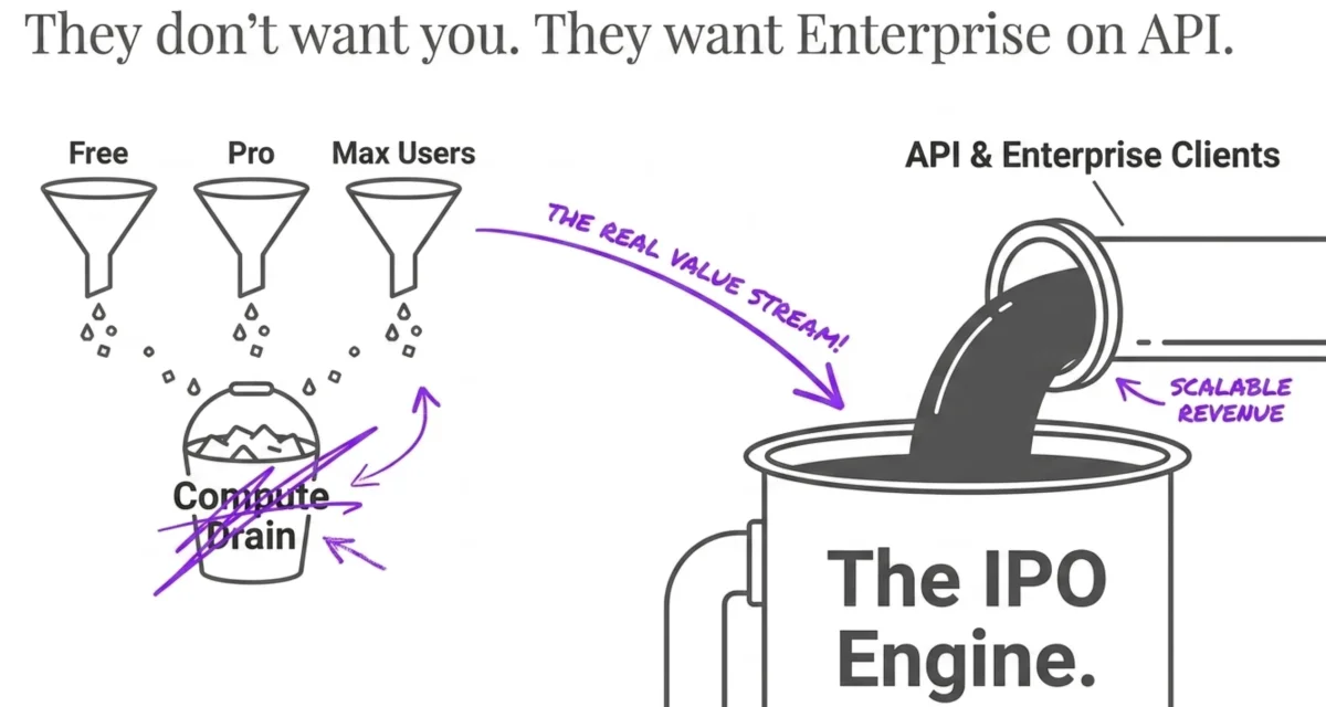 About 80% of Anthropic's revenue comes from enterprise and API. Not consumer subscriptions. They're heading into an IPO. They need to show profitability. Individual subscribers are cost centres, not profit drivers.