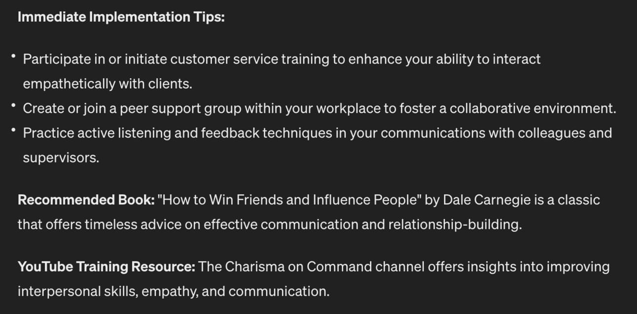 For each area provide 3 tips for immediate implementation, one book and one Youtube training resourceThis will extend the work by putting together starter resources like so: