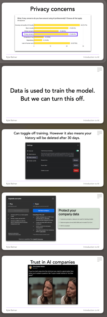 My favourite questions here are when people ask a specific business problem and how I’d use AI to help. These are great because I can immediately help one person go away and use AI to deal with something that’s been annoying for them. When others see this in action they start to think about what they can use AI for to.