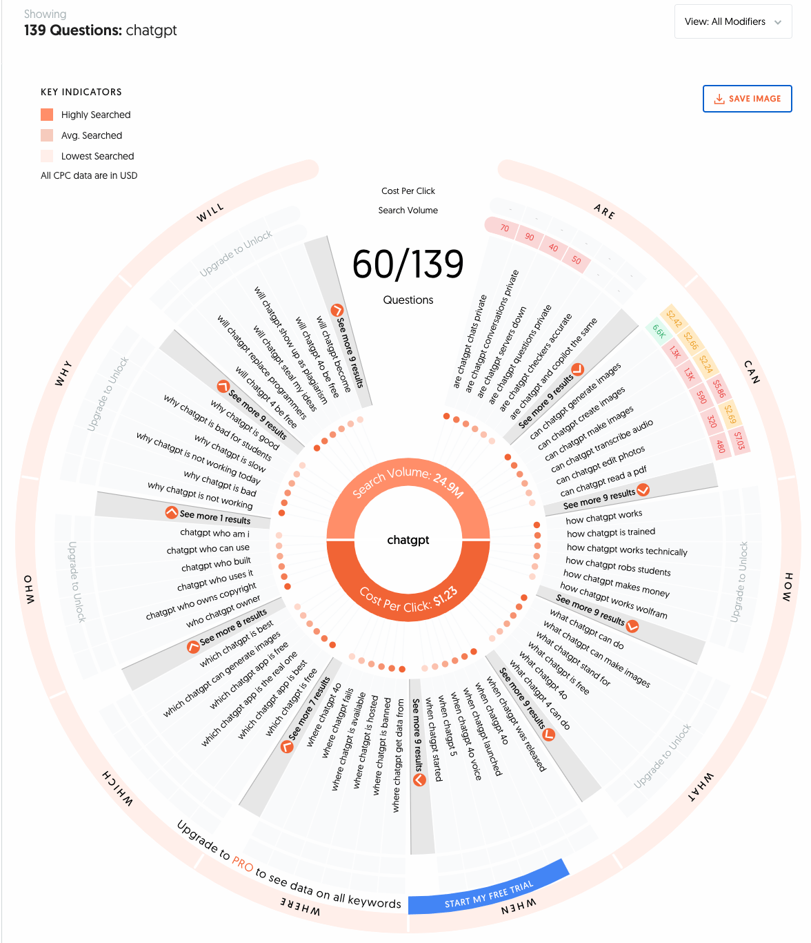 Head over to https://answerthepublic.com and plug in a keyword connected to your business. For me, it might be "AI", "AI education", or "ChatGPT". The free version is enough to get started with.