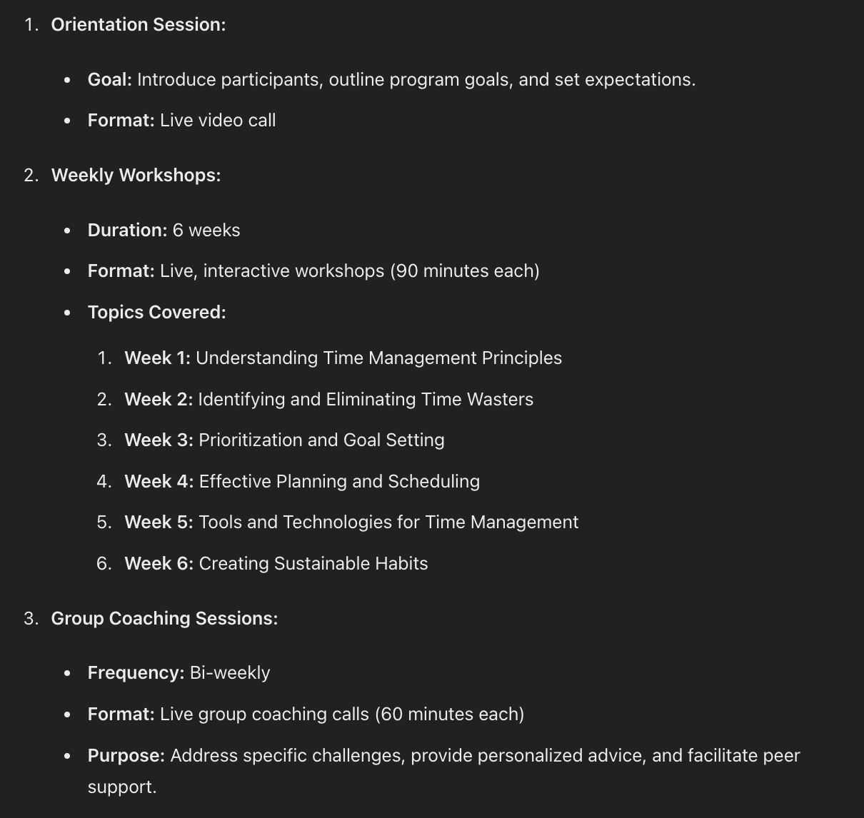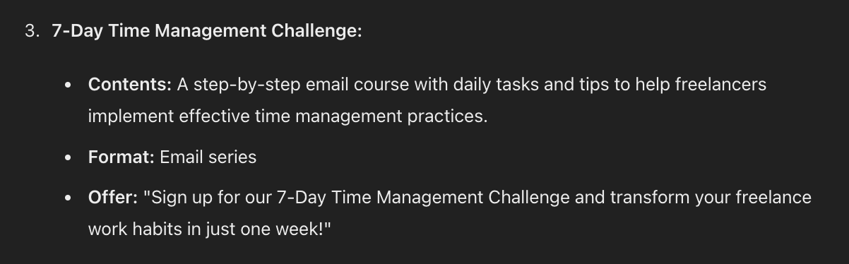 Outline the key components, structure, and potential pricing for your cohort or service offer, keeping in mind the value you'll provide by solving my audience's problemWhen I plug in “freelancers struggling to manage time” as my audience and their core problem I get a list of lead magnet and first offer results, all aligned along the stated problem.