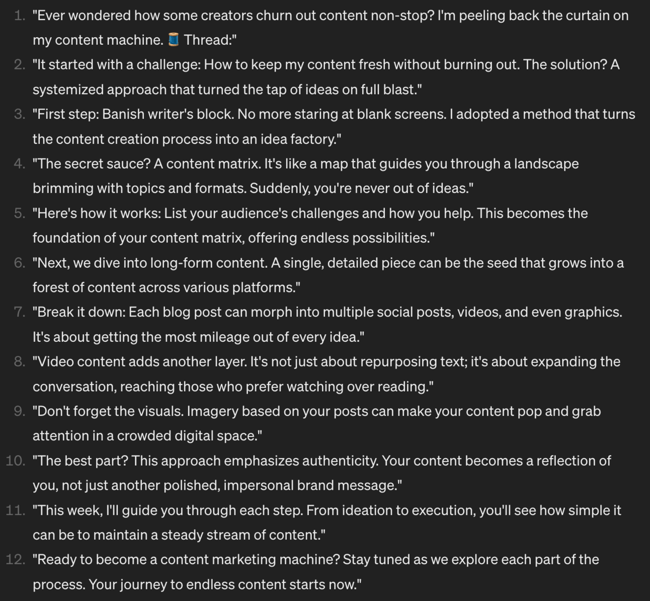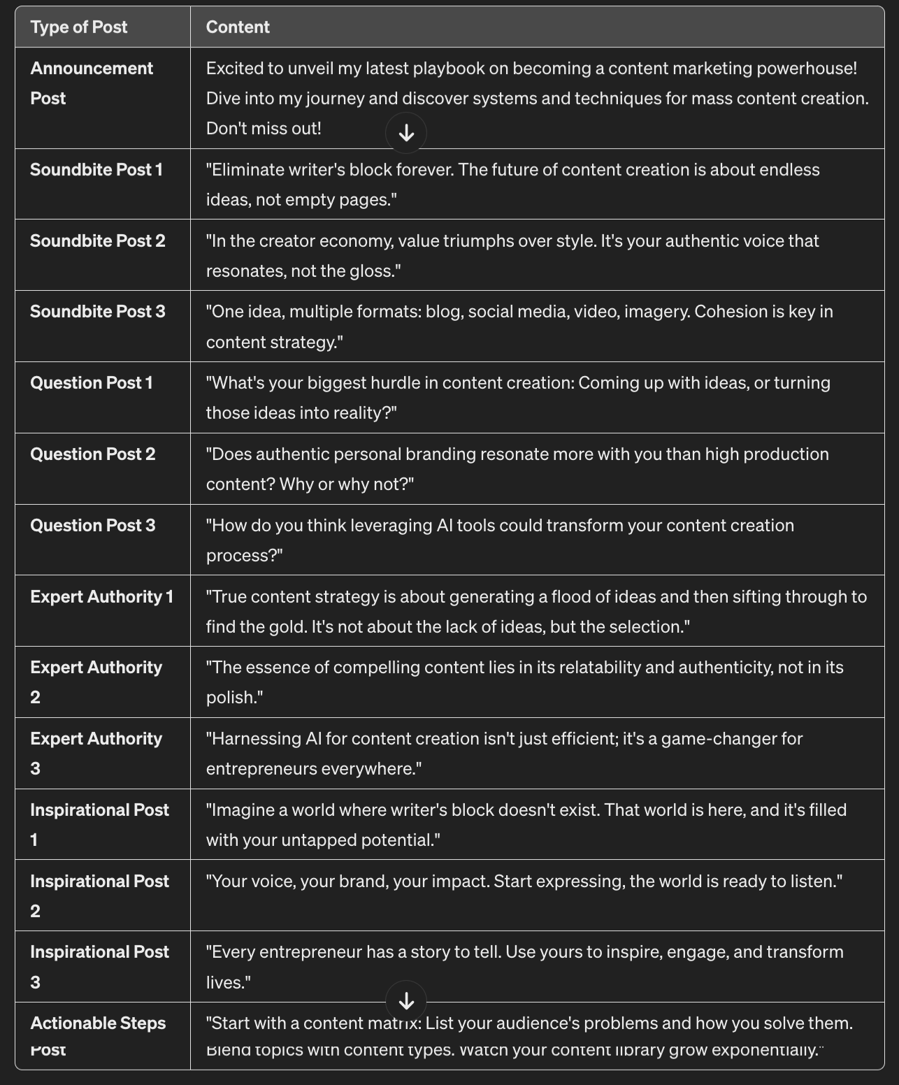 The above prompt makes short form posts which work great on X, Facebook or LinkedIn.