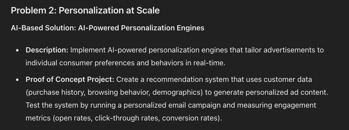 And for each solution suggest a proof of concept projectI plugged in “consumer goods advertising” as my sector and got a range of problems, solutions and proof of concept projects.