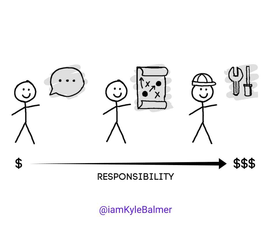 Because of this increased responsibility there is also a continuum of payment. Advisory → Consultancy → Implementation increases effort, workload, risk and thus how much you charge.