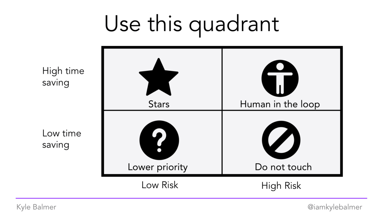 Run workshops with your team to plot their tasks on this matrix. The sweet spot? High time savings, low risk. That's where you start building your prompt library (and then onward and upward to custom Apps etc.)