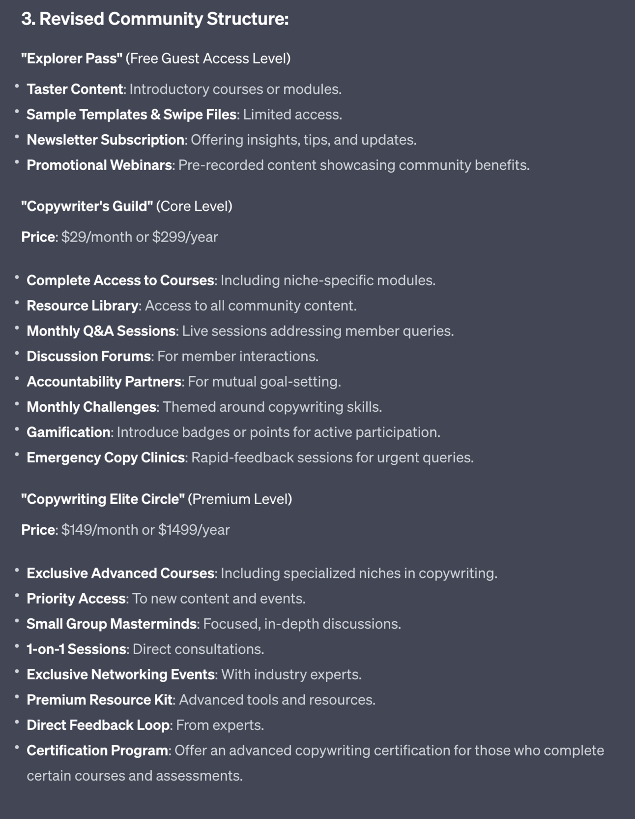 For each level provide a name and indicative pricing.I’ve used this prompt below the existing chat so that ChatGPT can pull in details about the content and community features we brainstormed.