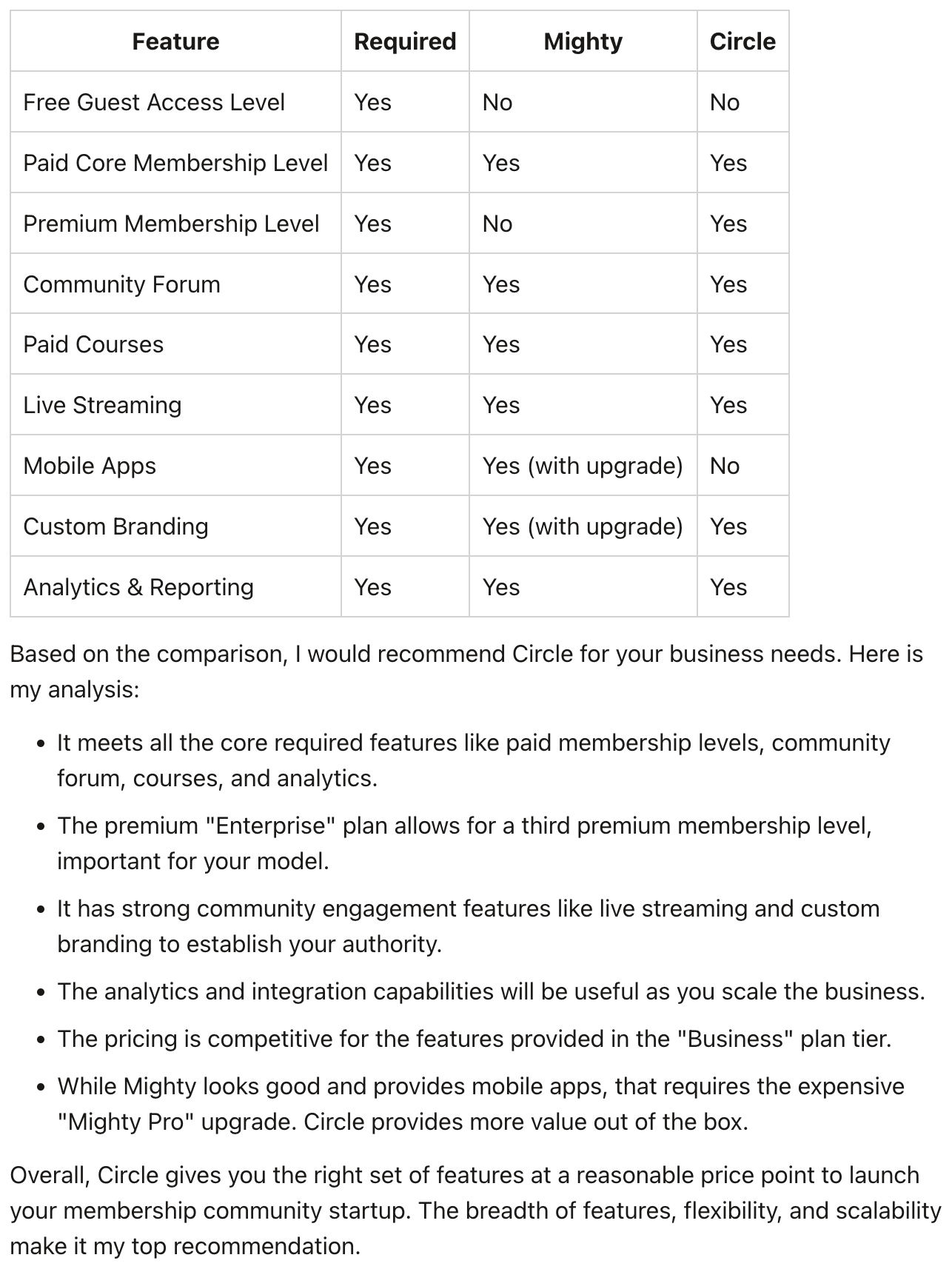 I know for example that Circle has a mobile app that allows all users to access the community easily on a phone. But ChatGPT has missed that in its analysis. Remember to check results before making big decisions!