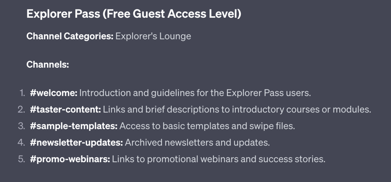 First up ChatGPT gives us our free access level. This one is nice and simple with a Welcome, taster, swipe file, newsletter and webinar channel.