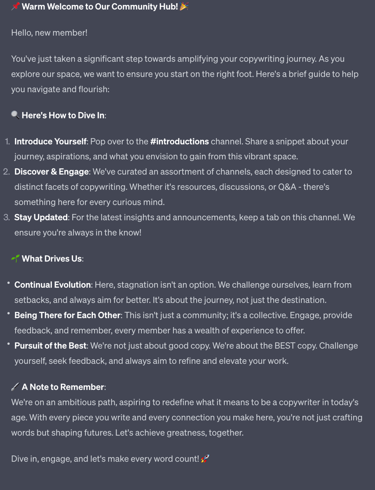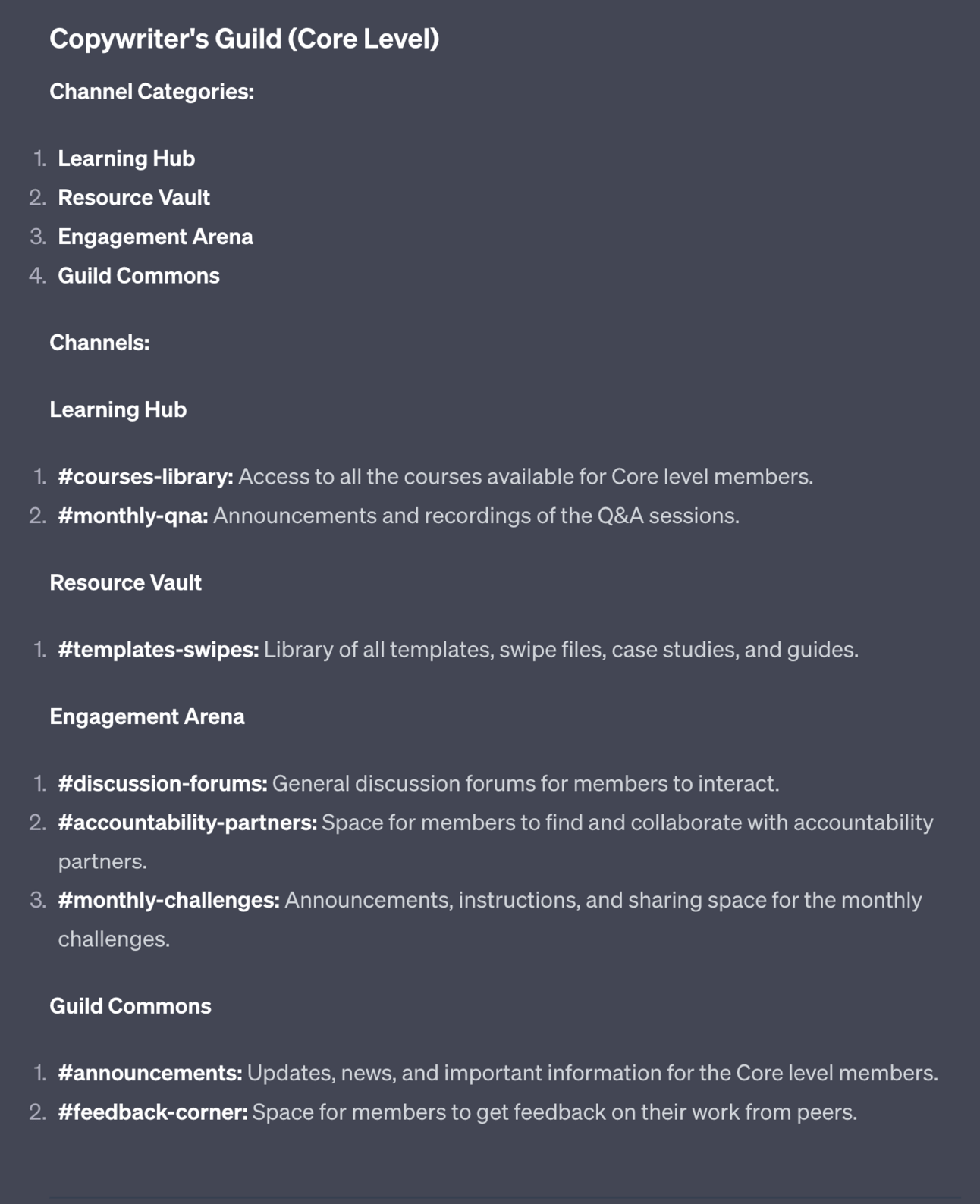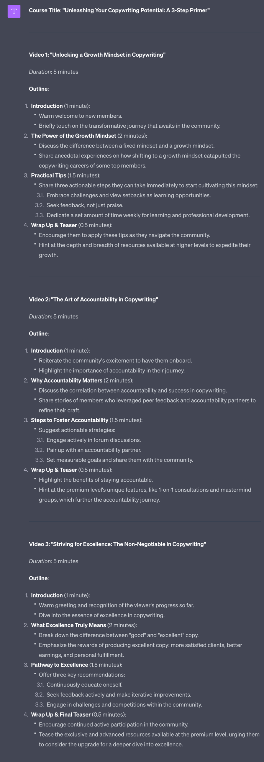 In this output I fed in the specific course structure of the Copywriting Academy community that I’ve been using as an example.