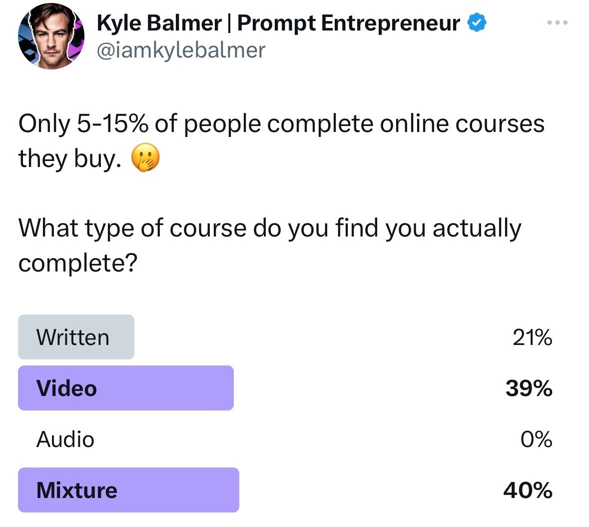 I asked whether you prefer courses with text, video, audio or a bit of everything. Specifically what sort of course format helps you actually finish the course and apply what you learn!