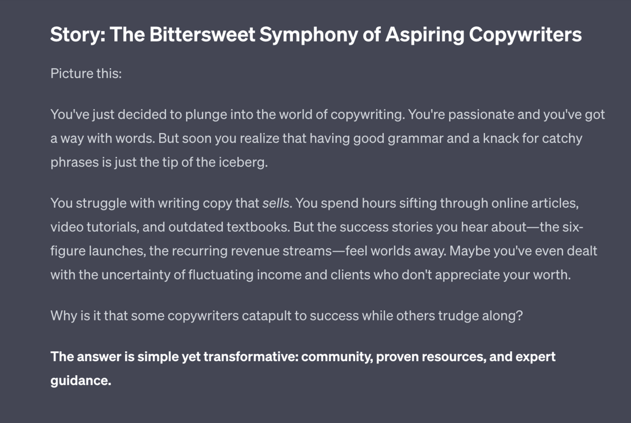[copy/paste mission, vision, values, big idea] This generates a very long (full sales page) output so I’ll just provided a snippet: