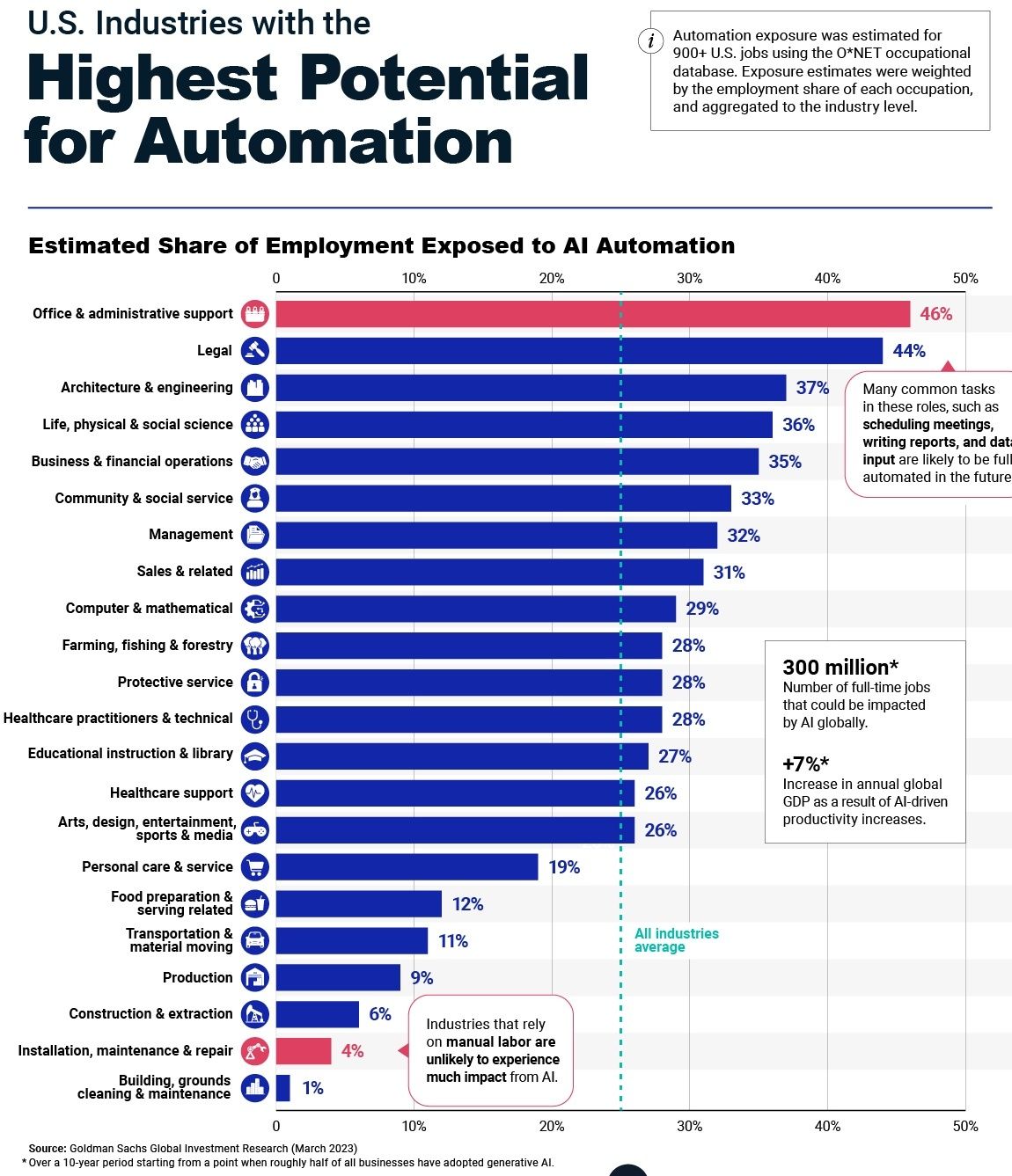 This is also partly why the legal industry is one of the most susceptible to AI automation (#2 with 44% of jobs exposed):