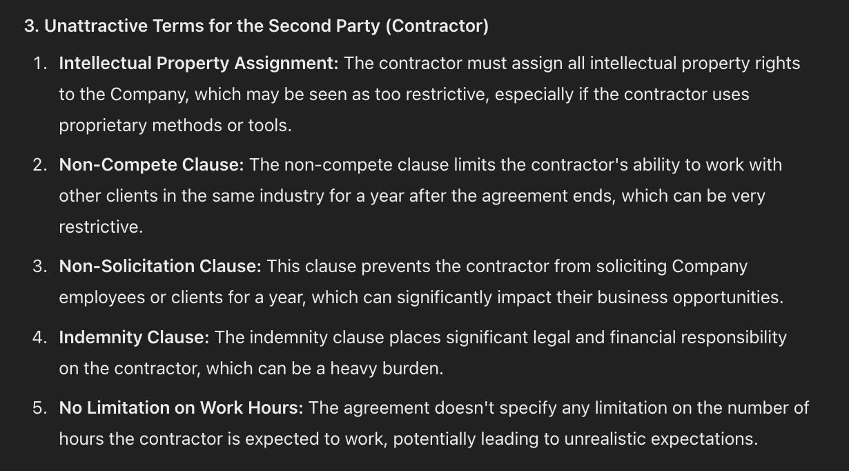 It will also highlight terms and clauses that are unattractive to each party. Here are the terms unattractive to the independent contractor for instance:
