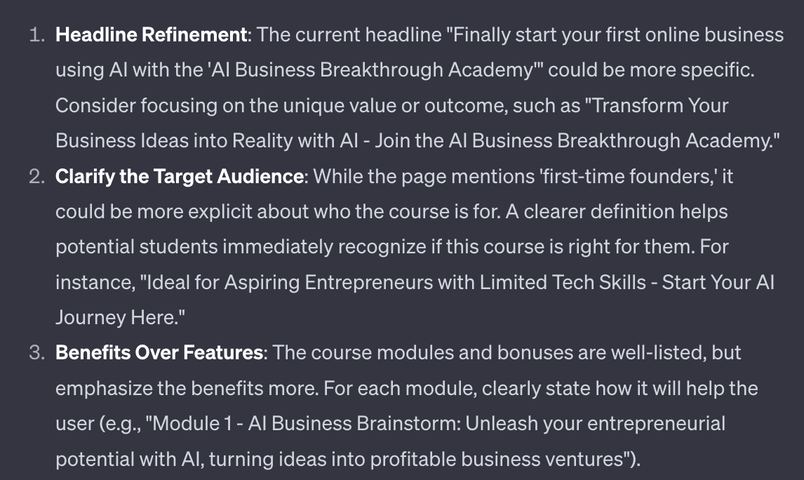 In the example below I fed my GPT my AI Business Accelerator Academy sales landing page and asked for specific recommendations for improvements: