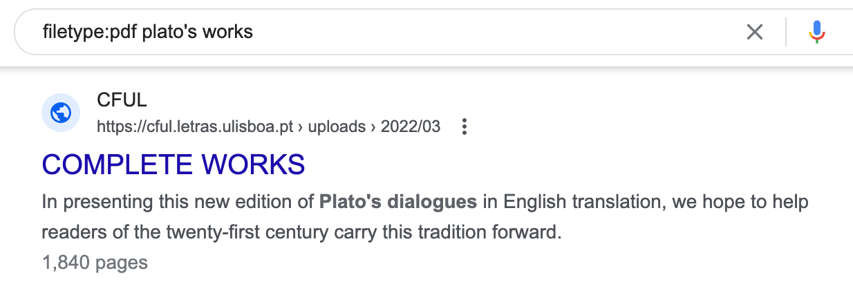 I’ve typed “filetype:pdf plato’s works” as my search.