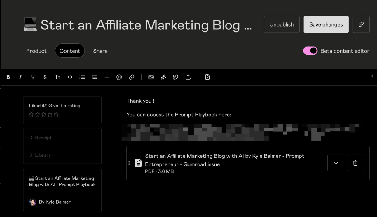 The next tab in Gumroad is for the actual product contents that are unlocked when the customer makes a purchase.