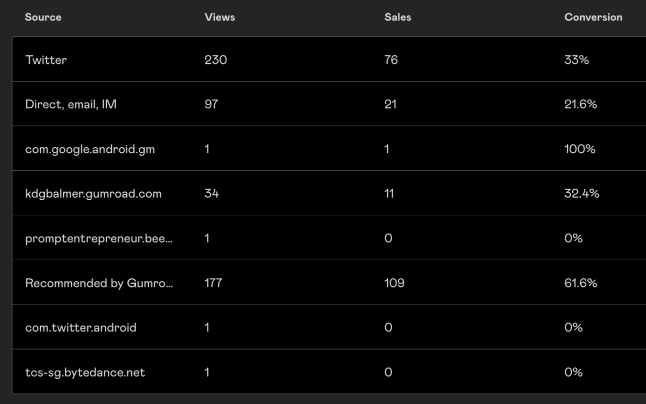 Most traffic (230 views, 76 sales, 33% conversion) comes from Twitter/X which is not too surprising.