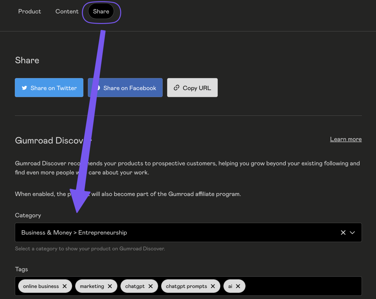 Gumroad has built in affiliate marketing thankfully, making setting this up simple. It is however a little bit hidden.