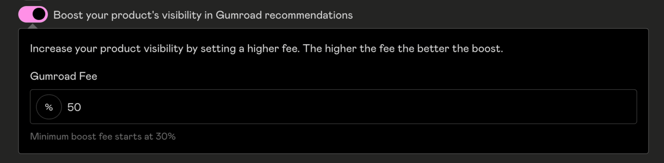 Notice you can also set the percentage you are willing to give Gumroad. This is up to you - the higher the fee the more they will boost.