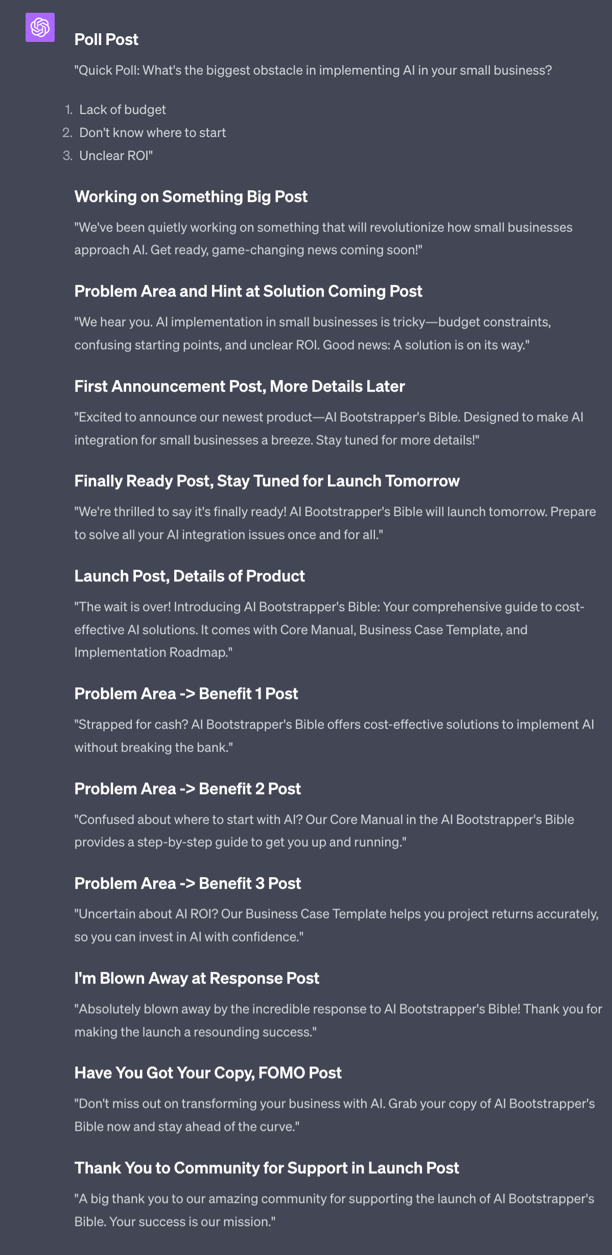 ChatGPT now gives me a whole launch sequence for social media. I’ve crafted these as short Twitter/X messages - you can go longer if using LinkedIn or another platform but I’d recommend short and punchy.