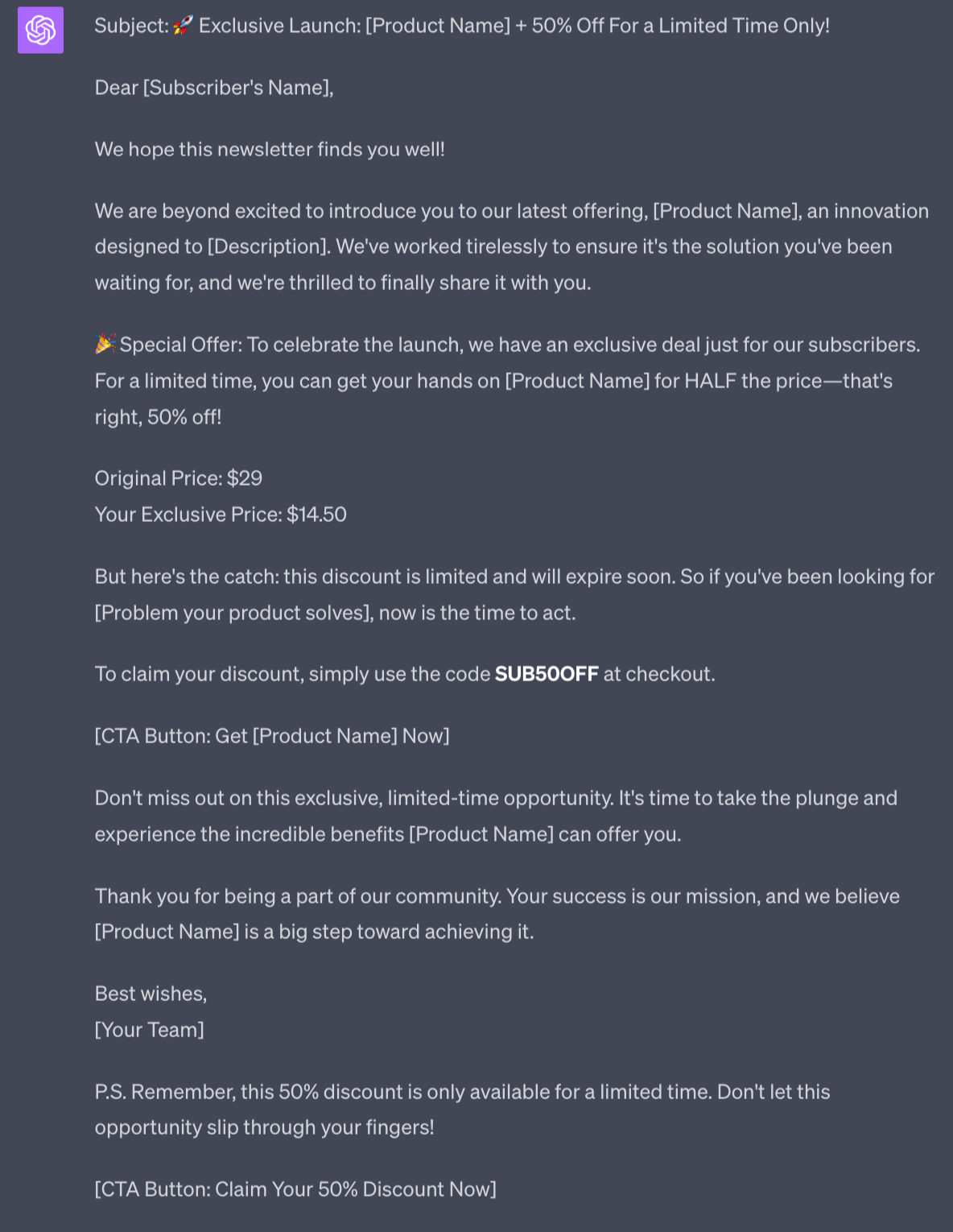 Once you have a discount set up add a section to an upcoming newsletter with an announcement. Here’s a nice simple prompt: