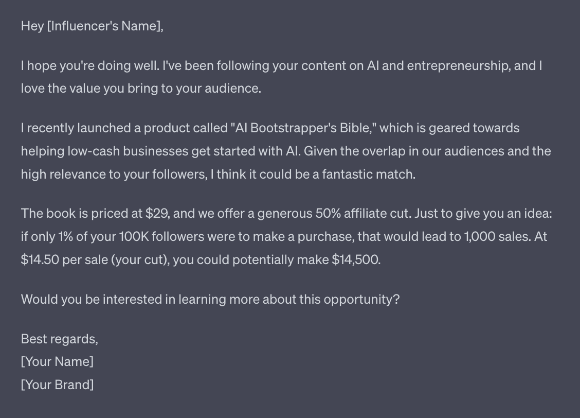 Mention that the price is [price] and affiliate cut is [%] and give illustrative examples of how 1% conversion from their [follower count] followers would lead to a certain profit. Plug in the required details, including their follower count.