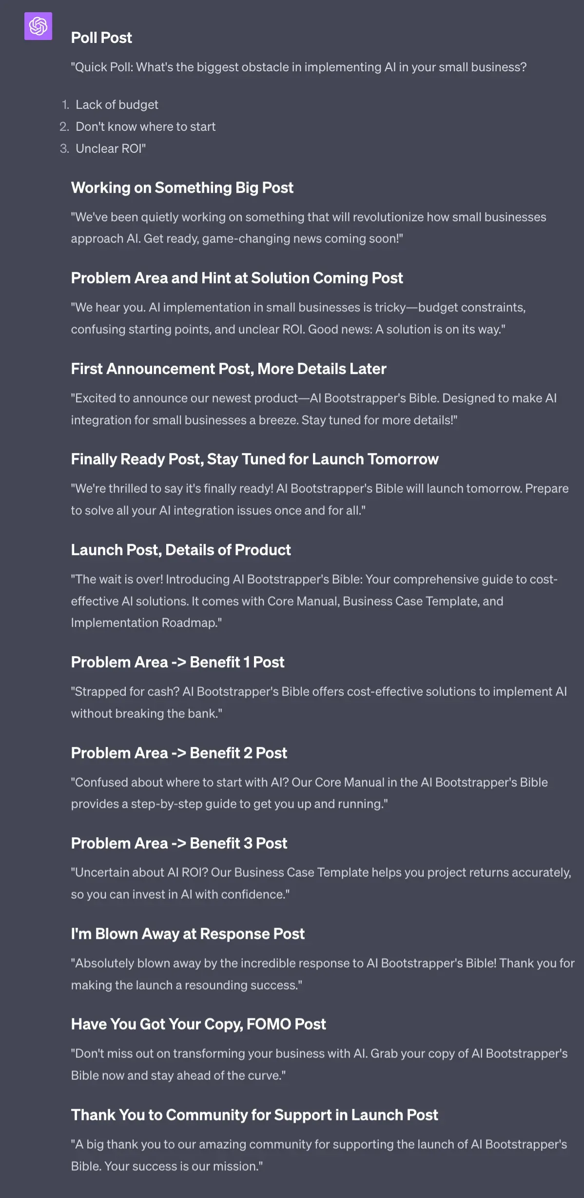 ChatGPT now gives me a whole launch sequence for social media. I’ve crafted these as short Twitter/X messages - you can go longer if using LinkedIn or another platform but I’d recommend short and punchy.