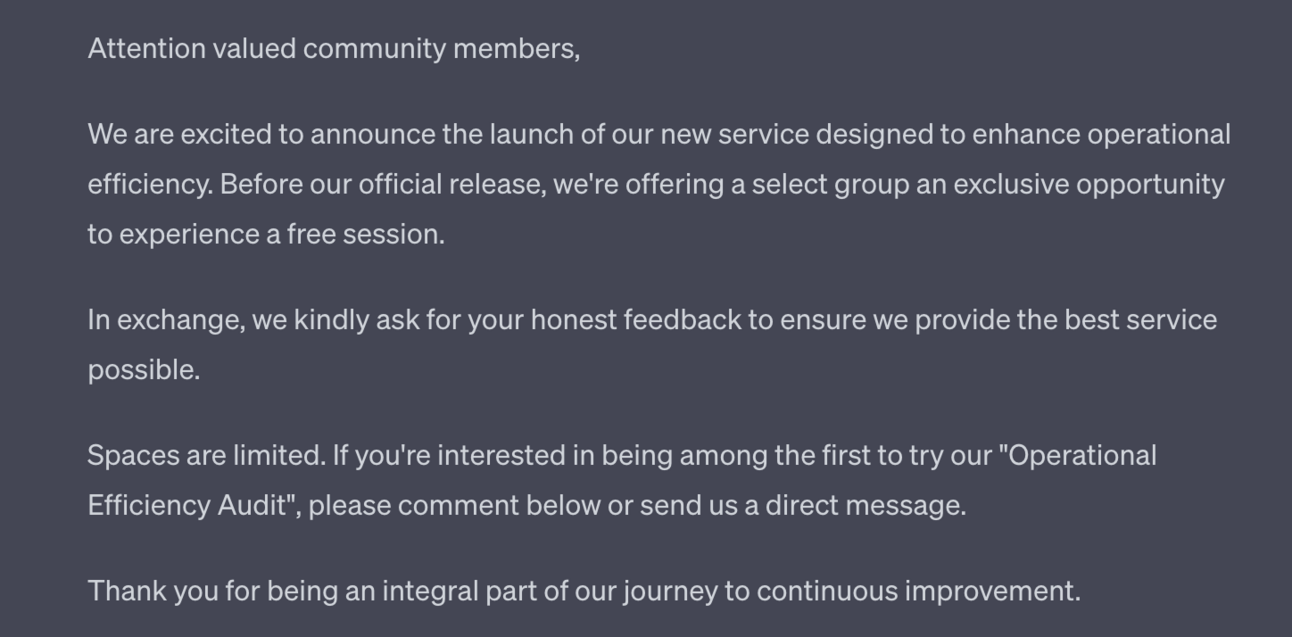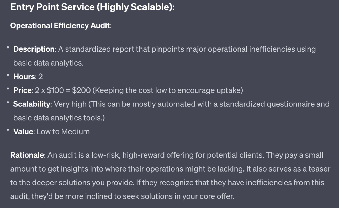 Second, ChatGPT repeats back our core offer. We used that in the input so do not need to repeat here.