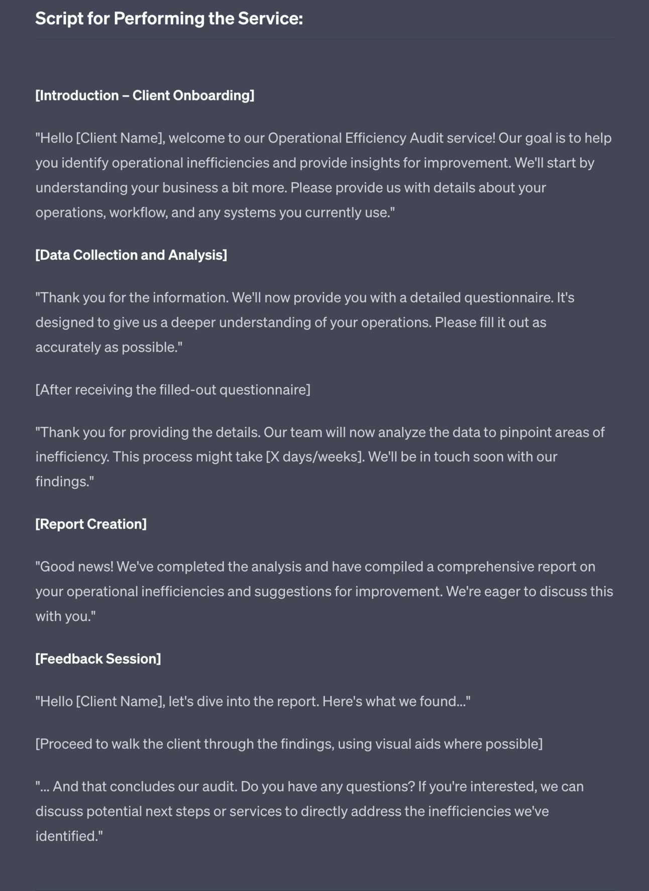 Finally ChatGPT will output scripts for delivering the service: