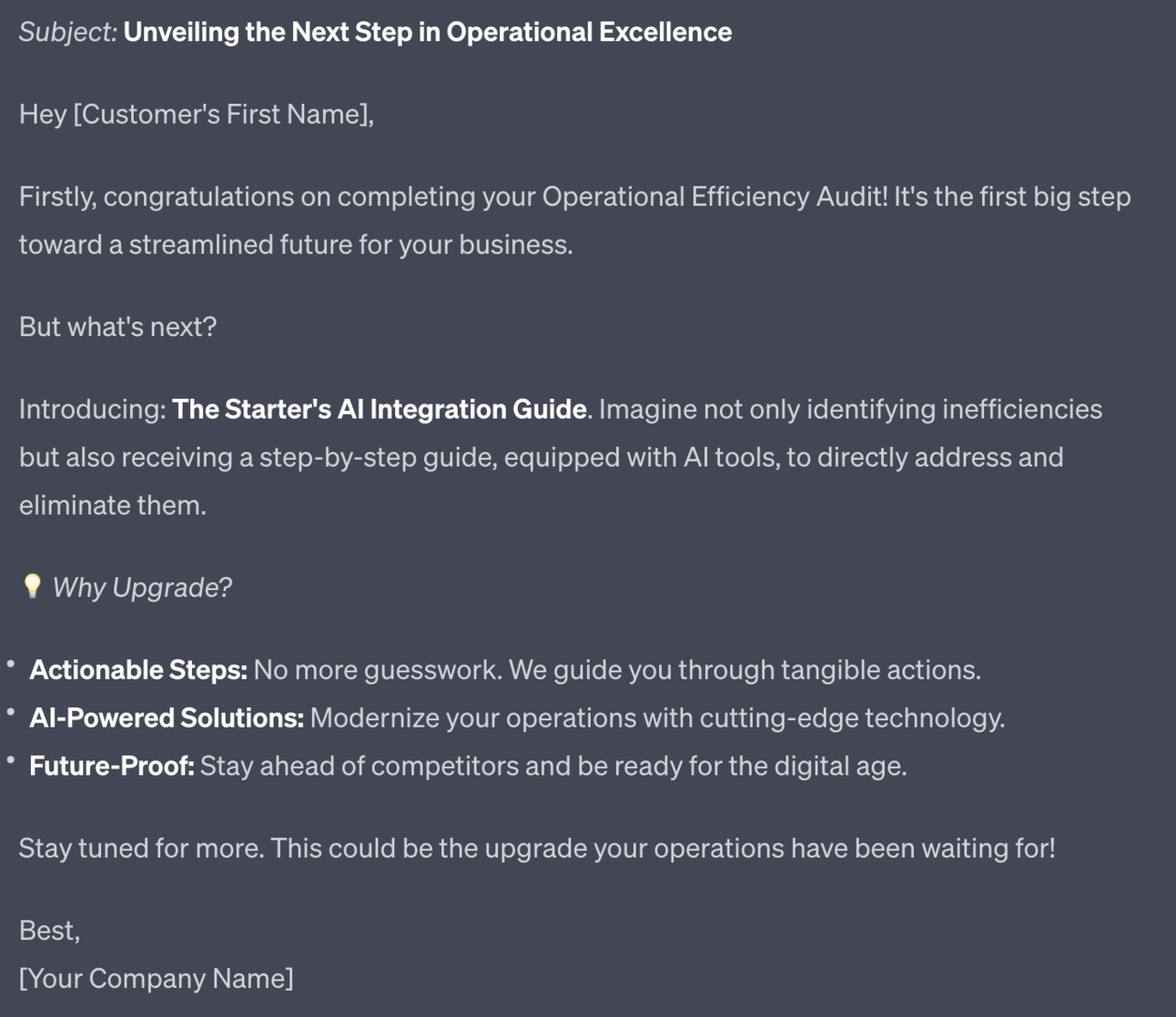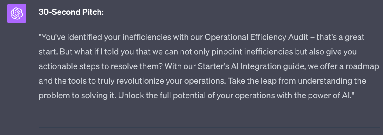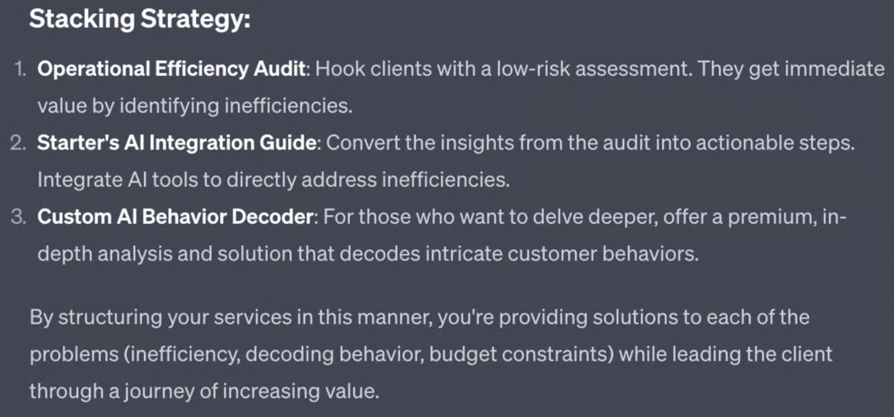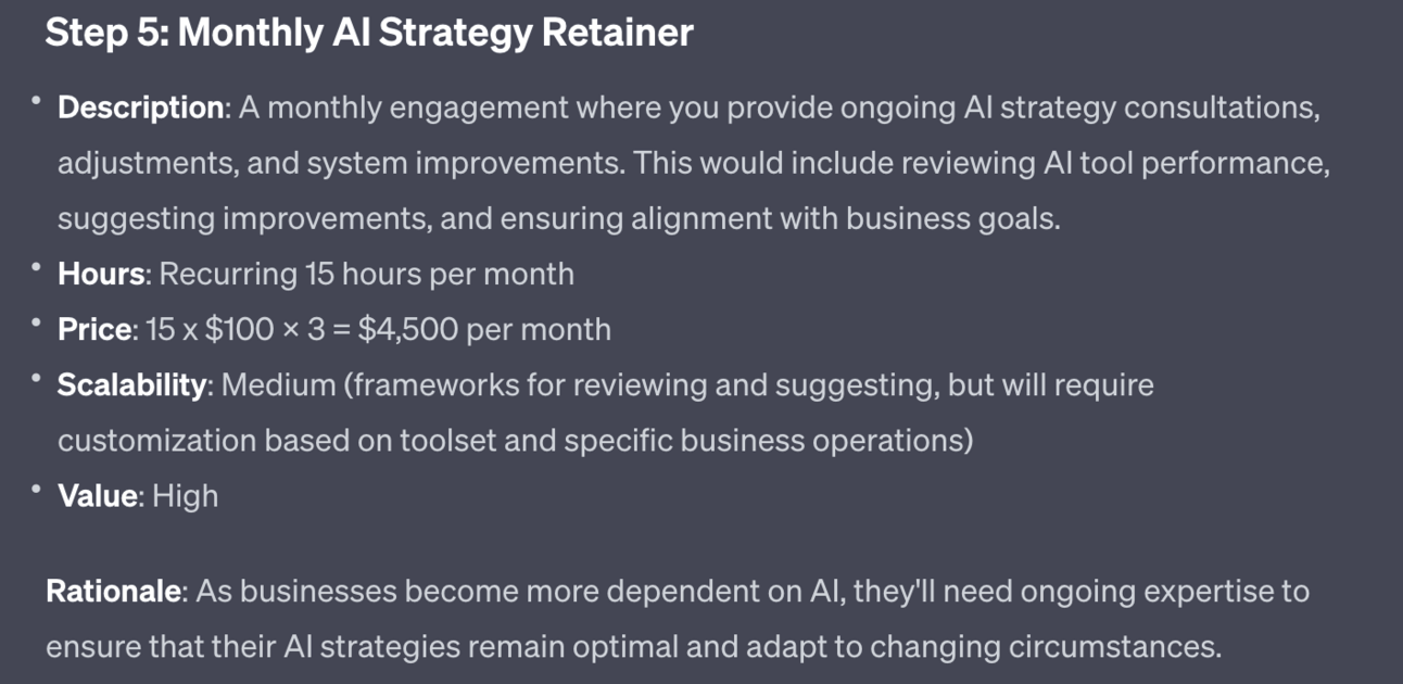 ChatGPT will generate more higher cost and recurring income services. The above is an example of a $4500 retainer service you could add into your stack.