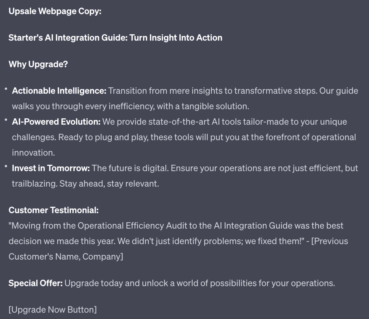 - copy for an upsale webpageFor this example I referred back to Part 2 where we design our service stack and filled in the service names and descriptions.