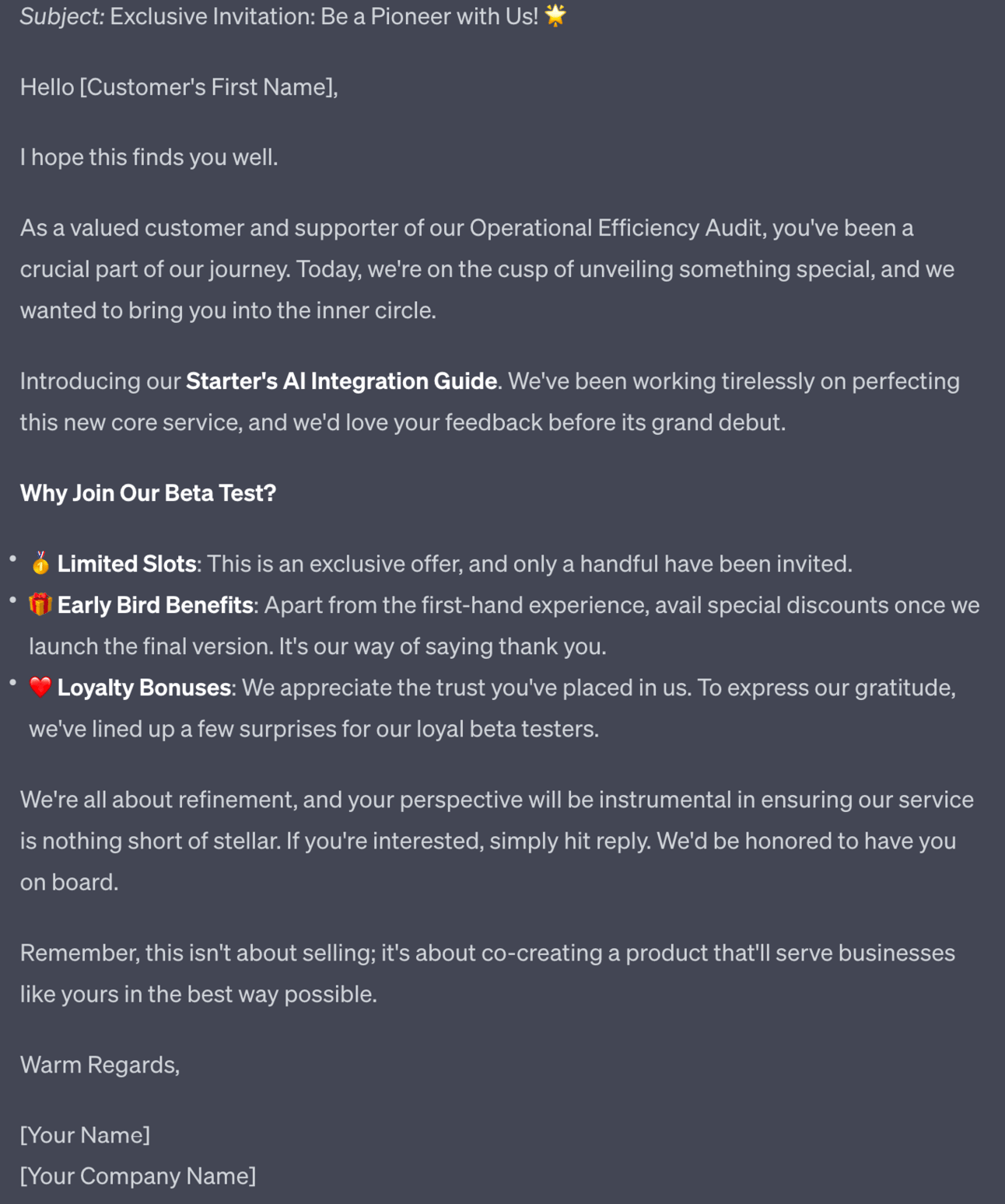 Write a short email inviting customers of the entry level offer to beta test the core service