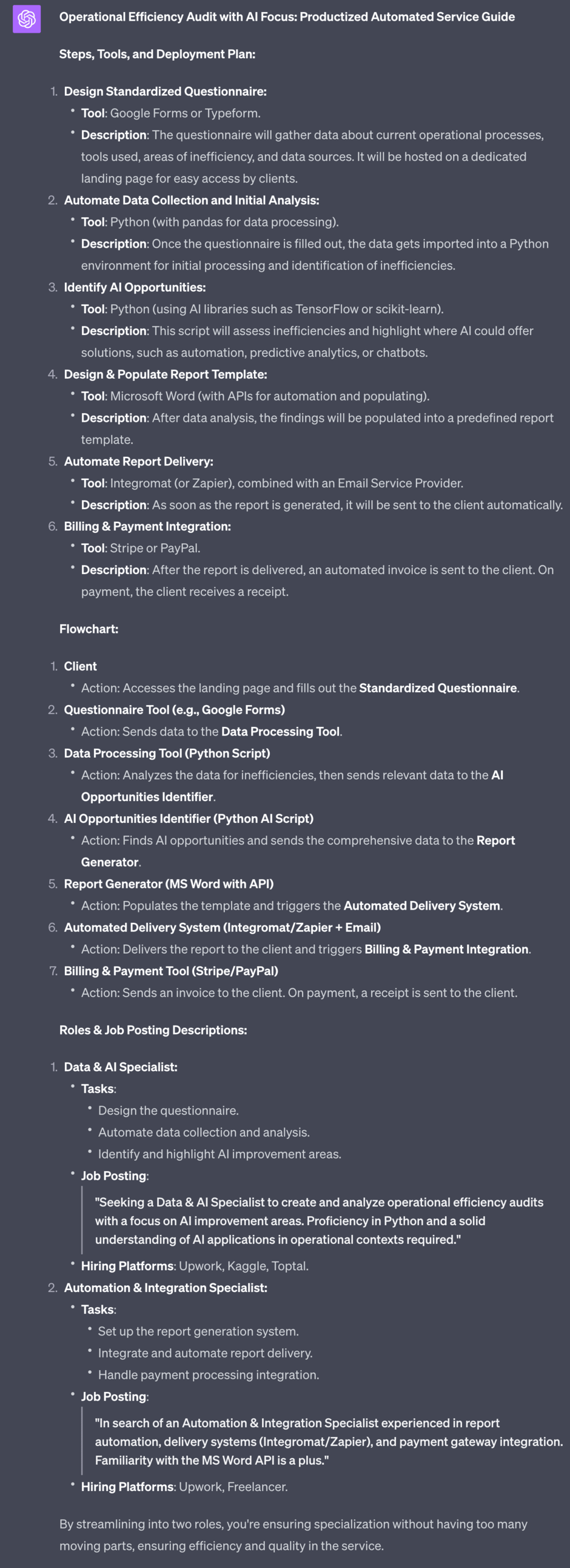 This prompt generates a plan for productising a service including an outline of the process, a flowchart and the roles you’ll need to hire to get the work done.