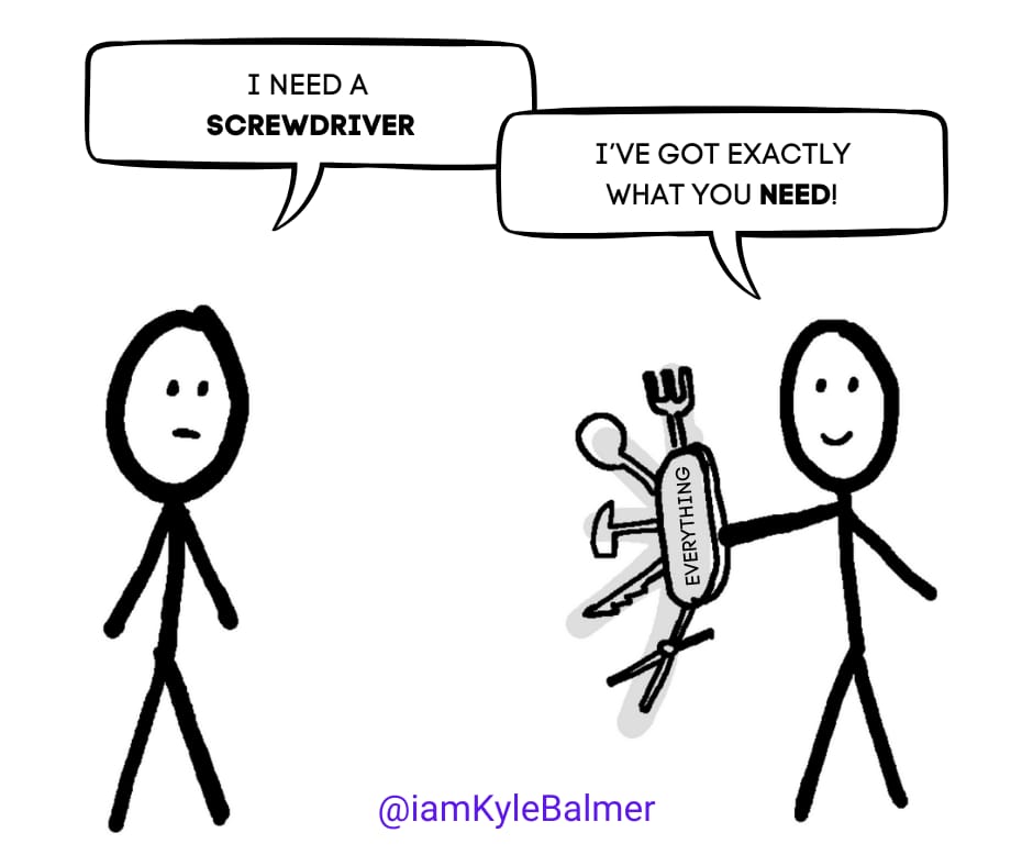 Imagine you're at a networking event. In one corner, there's someone talking about their "AI-powered productivity suite with 57 features to revolutionise your workflow." (Swiss Army Knife). In the other corner, there's you, saying, "My AI app writes email subject lines that double open rates."