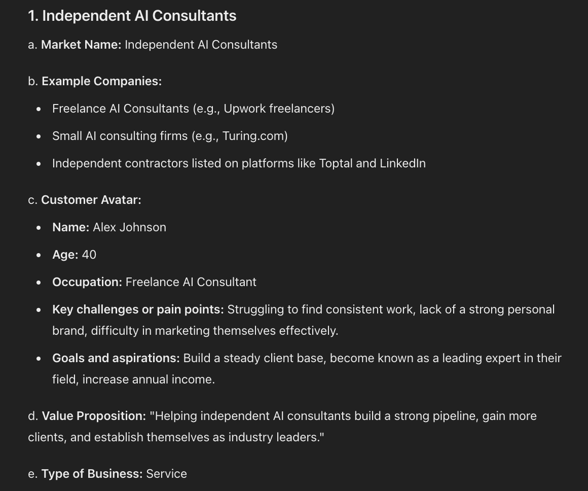 Remember to be thorough in your questioning, creative in identifying potential markets, and clear in articulating value propositions. Your goal is to help the user understand how their business idea might create value for different types of customers.I’ll run this prompt with this ikigai idea from the last Part: