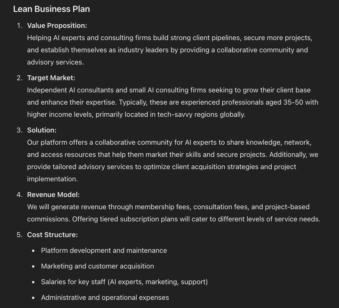 I ran it with the AI Experts Consultancy Community and got the following lean business plan. Here’s the first half of the output: